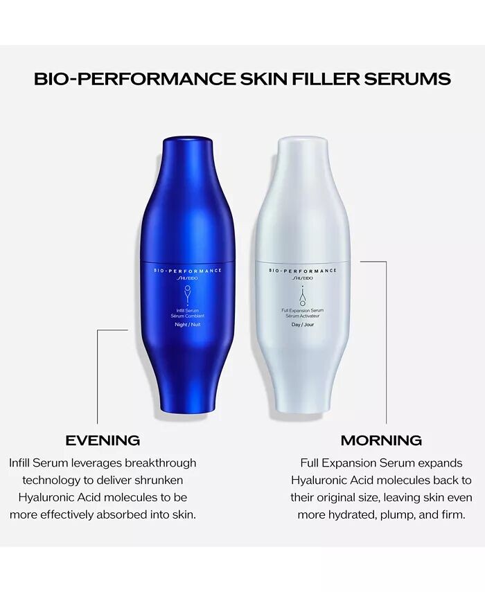 Быстро уменьшите признаки времени с помощью революционной технологии Shiseido Molecu Shift, которая сначала сжимает, а затем увеличивает молекулы гиалуроновой кислоты, увеличивая объем кожи изнутри. Заметно упругая и упругая кожа за два шага! Shiseido была первой косметической компанией, которая произвела безопасную, высококачественную биогиалуроновую кислоту с вдвое большей увлажняющей способностью, и последние 40 лет она продолжала заниматься инновациями и лидировать в исследованиях гиалуроновой кислоты.