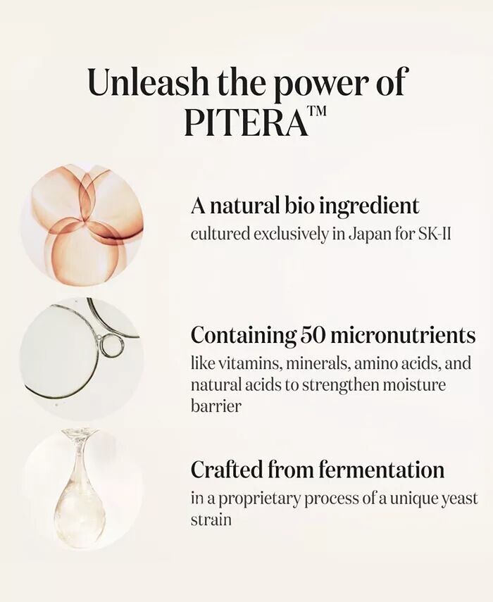 PITERA™ — запатентованный натуральный биоингредиент SK-II. полученные в результате ферментации. Он улучшает многочисленные аспекты видимых повреждений и старения кожи. PITERA стимулирует естественное воспроизводство гиалуроновой кислоты в коже посредством увлажнения.