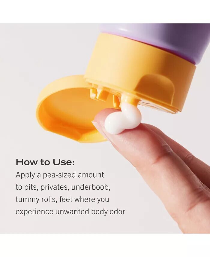 Нанесите небольшое количество горошины. относятся к областям, где вы ощущаете нежелательный запах тела, например, ямки, интимные места, складки на животе и ступни.