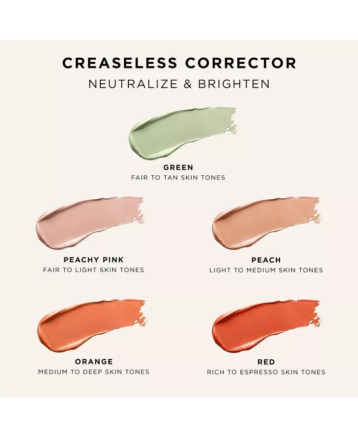 ЧТО ЭТО: Кремовый корректор цвета, который поможет улучшить цвет лица. ЧТО ЭТО ДЕЛАЕТ: Зеленый: нейтрализует покраснения и пятна; идеально подходит для всех оттенков кожи Персиковый: нейтрализует темные пятна под глазами и обесцвечивание; идеально подходит для светлых и средних тонов кожи. Оранжевый: нейтрализует темные пятна под глазами и обесцвечивание; идеально подходит для средних и глубоких тонов кожи. Персиково-розовый: осветляет темные пятна и компенсирует тусклость; идеально подходит для всех оттенков кожи Красный: нейтрализует темные пятна под глазами и обесцвечивание; идеально подходит для очень темного тона кожи. ОСНОВНЫЕ ИНГРЕДИЕНТЫ: Морошка богата витамином С и омега-3 и 6, которые придают коже пухлость и сияние. Алмазная пудра помогает скрыть недостатки Амазонская глина для лучшего, более естественного цвета. более длительный срок службы Масло маракуйи богато незаменимыми жирными кислотами и витамином С, которые делают кожу более упругой, яркой и гладкой Бакучиол помогает уменьшить появление тонких линий и выравнивает внешний вид кожи Ниацинамид помогает осветлить и минимизировать внешний вид сужает поры Кофеин наполняет кожу энергией, уменьшая отечность Алоэ известно успокаивающим увлажняющим действием Асаи — мощный антиоксидант, содержащий витамины A, B, C и E, которые помогают восстановить влагу Ацерола Богат антиоксидантами, осветляет и выравнивает внешний вид кожи. Гранат обеспечивает максимальное увлажнение. Маракуйя богата витаминами А и С, увлажняет и придает объем. Арбуз богат витамином С и увлажняет. Клубника богата витамин С для сияющей и ровной кожи Черника богата витаминами А, С и Е Клюква придает сияние Лимон богат антиоксидантами Витамин Е является консервантом, который также действует как смягчающее и антиоксидантное действие СПОСОБ ИСПОЛЬЗОВАНИЯ: Проведите пальцем по проблемной области, а затем растушуйте пальцами, спонжем или кистью. Завершите нанесение консилера Creaseless Concealer (продается отдельно) для гладкого и безупречного результата.