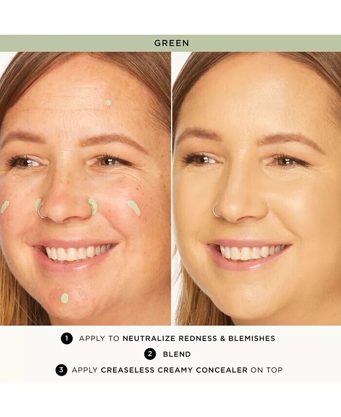 ЧТО ЭТО: Кремовый корректор цвета, который поможет улучшить цвет лица. ЧТО ЭТО ДЕЛАЕТ: Зеленый: нейтрализует покраснения и пятна; идеально подходит для всех оттенков кожи Персиковый: нейтрализует темные пятна под глазами и обесцвечивание; идеально подходит для светлых и средних тонов кожи. Оранжевый: нейтрализует темные пятна под глазами и обесцвечивание; идеально подходит для средних и глубоких тонов кожи. Персиково-розовый: осветляет темные пятна и компенсирует тусклость; идеально подходит для всех оттенков кожи Красный: нейтрализует темные пятна под глазами и обесцвечивание; идеально подходит для очень темного тона кожи. ОСНОВНЫЕ ИНГРЕДИЕНТЫ: Морошка богата витамином С и омега-3 и 6, которые придают коже пухлость и сияние. Алмазная пудра помогает скрыть недостатки Амазонская глина для лучшего, более естественного цвета. более длительный срок службы Масло маракуйи богато незаменимыми жирными кислотами и витамином С, которые делают кожу более упругой, яркой и гладкой Бакучиол помогает уменьшить появление тонких линий и выравнивает внешний вид кожи Ниацинамид помогает осветлить и минимизировать внешний вид сужает поры Кофеин наполняет кожу энергией, уменьшая отечность Алоэ известно успокаивающим увлажняющим действием Асаи — мощный антиоксидант, содержащий витамины A, B, C и E, которые помогают восстановить влагу Ацерола Богат антиоксидантами, осветляет и выравнивает внешний вид кожи. Гранат обеспечивает максимальное увлажнение. Маракуйя богата витаминами А и С, увлажняет и придает объем. Арбуз богат витамином С и увлажняет. Клубника богата витамин С для сияющей и ровной кожи Черника богата витаминами А, С и Е Клюква придает сияние Лимон богат антиоксидантами Витамин Е является консервантом, который также действует как смягчающее и антиоксидантное действие СПОСОБ ИСПОЛЬЗОВАНИЯ: Проведите пальцем по проблемной области, а затем растушуйте пальцами, спонжем или кистью. Завершите нанесение консилера Creaseless Concealer (продается отдельно) для гладкого и безупречного результата.