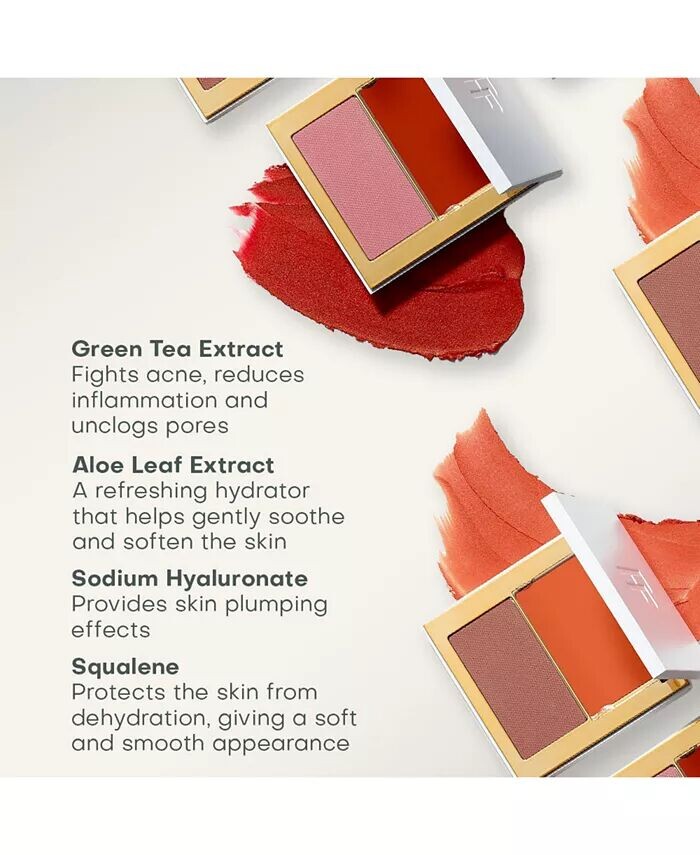 Нелипкие кремовые румяна тают на коже, оставляя естественный влажный оттенок без пепельных или серых подтонов, оставаясь при этом шелковистыми. гладкая пудра скрывает поры и тонкие линии, создавая матовый, устойчивый к складкам оттенок; сохраняет цвет и не окисляется