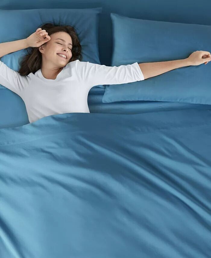 В комплект входит 1 натянутая простыня, 1 плоская простыня и 2 наволочки (1 двойного размера)