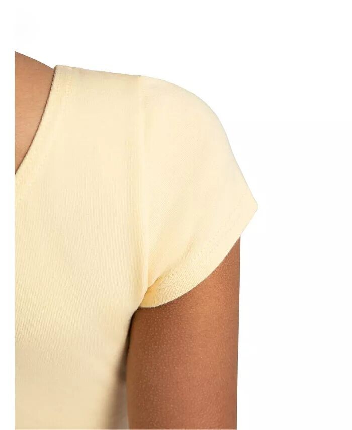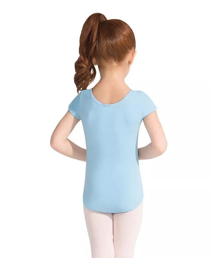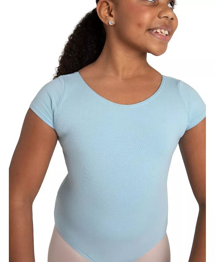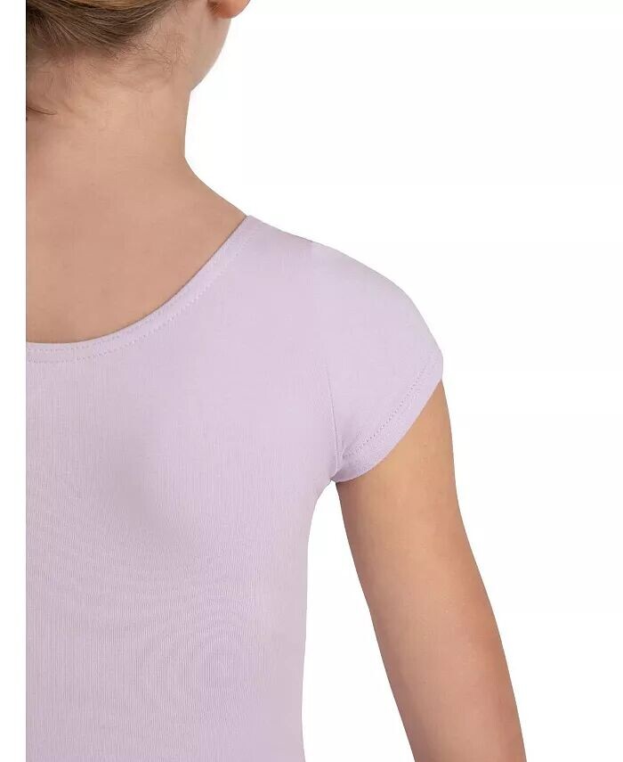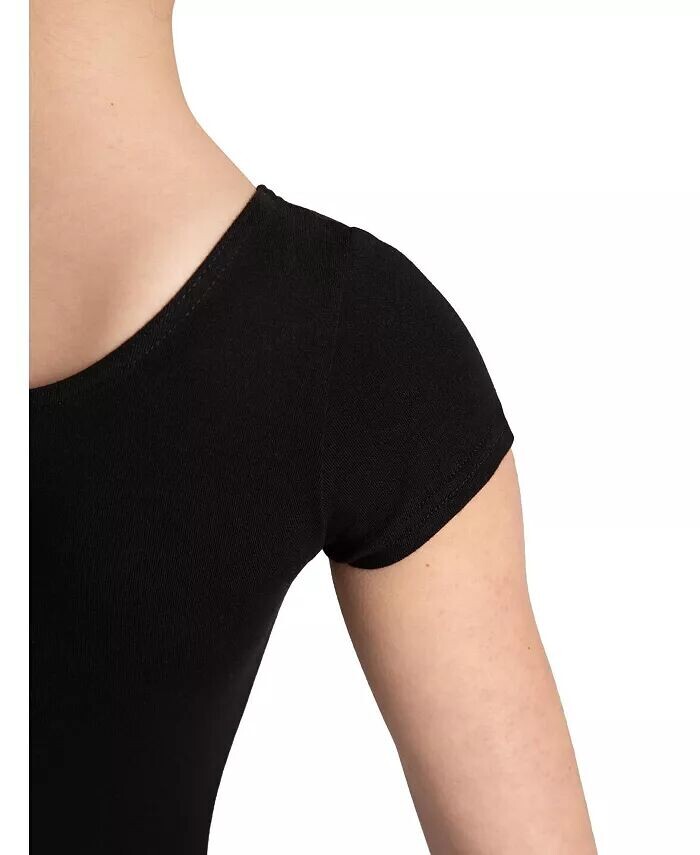 Хлопковое трико с короткими рукавами создает простой силуэт, который оптимален для работы в студии, репетиций и под спортивными штанами для повседневного образа. Этот купальник имеет классический овальный вырез спереди и сзади.