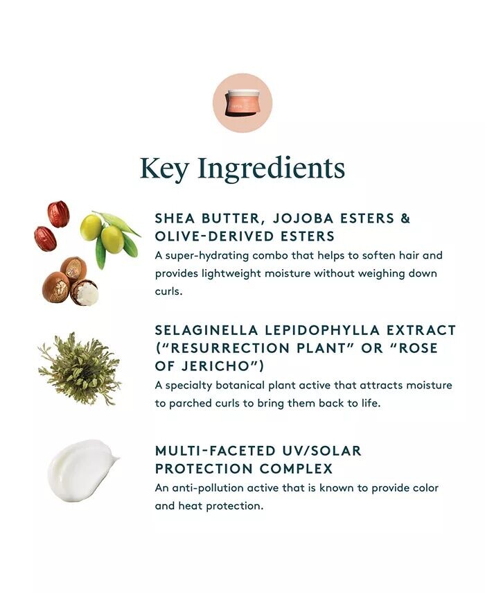 ЧТО ЭТО: Маслянистый насыщенный несмываемый крем для вьющихся волос 2–4 типов; безопасен для окрашенных и химически обработанных волос. ДЕЙСТВИЯ: Тает на волосах, не утяжеляя их; укрепляет, питает и придает блеск; обеспечивает интенсивное увлажнение, уменьшение пушистости, восстановление и защиту волос. ОСНОВНЫЕ ИНГРЕДИЕНТЫ: Масло ши, эфиры жожоба и эфиры оливы помогают смягчить волосы и обеспечить легкое увлажнение; Экстракт Selaginella lepidophylla (Иерихонская роза) притягивает влагу, возвращая локоны к жизни; многогранный комплекс обеспечивает защиту от ультрафиолета и солнца СПОСОБ ПРИМЕНЕНИЯ: Нанесите большое количество продукта на влажные или влажные волосы от корней до кончиков Не смывайте Наносите повторно при необходимости РЕЗУЛЬТАТЫ : 95% женщин почувствовали, что волосы сразу стали более эластичными, шелковистыми и выглядели помолодевшими* Всего через 8 часов 96% женщин почувствовали, что их волосы стали менее ломкими* 93% женщин почувствовали, что их волосы стали более ломкими* 93% женщин почувствовали, что их волосы стали более ломкими. более послушные и увлажненные, напитанные и более блестящие через 1 неделю* Через 2 недели 96% женщин заметили восстановительный эффект и почувствовали, что волосы стали более здоровыми и мягкими* 94% фетровых волос не выглядели вьющимися уже после 1 использования* 94% заявили, что чувствуют себя более уверенно* *На основе исследования потребительского восприятия с участием 64 женщин, которые использовали несмываемое масло Curl в течение 2 недель ИСПОЛЬЗУЙТЕ С: Шампунем для локонов Кондиционером для локонов