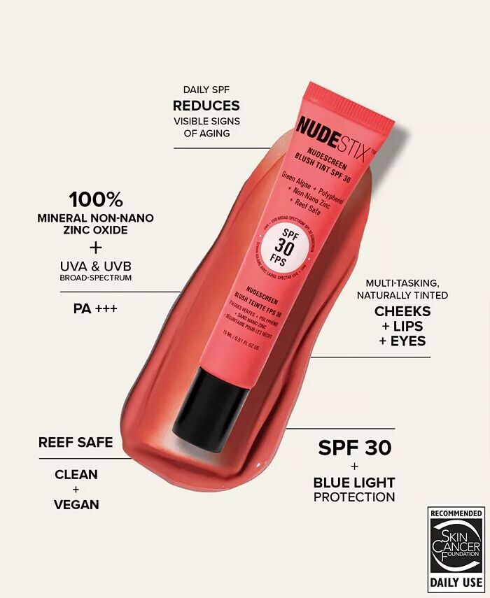 Nudescreen Blush Tint SPF 30 — это румяна с SPF 30, в состав которых входит 100% минеральный ненанооксид цинка и богатые полифенолами экстракты зеленых водорослей, пассифлоры и пурпурного чая для ежедневной защиты окружающей среды от ультрафиолетовых лучей солнца, а также защиты от синего света. с повседневных цифровых устройств.