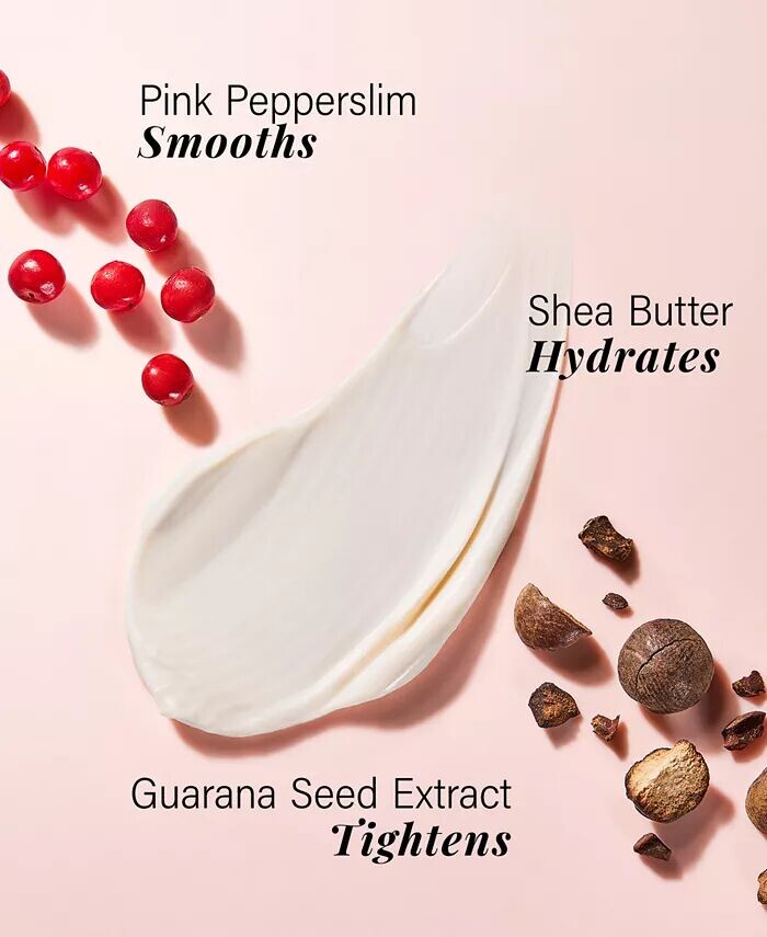 Гуарана экстракт семян с высоким содержанием кофеина заметно уменьшает отечность и делает кожу более подтянутой; экстракт розового перца заметно разглаживает текстуру кожи; масло ши помогает смягчить и увлажнить кожу, заметно улучшая ее эластичность.