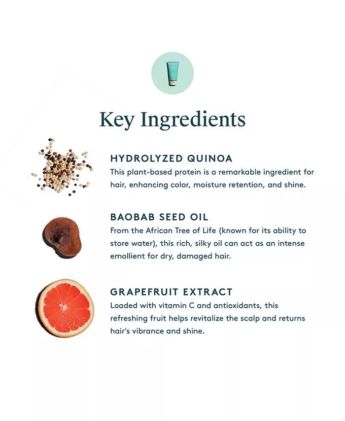 ЧТО ЭТО: Насыщенный кремовый кондиционер для всех типов волос, особенно для поврежденных или нуждающихся в дополнительном уходе; идеально подходит для волос, подвергшихся стрессу и обезвоженных в результате термической укладки или химической обработки; безопасен для окрашенных и химически обработанных волос. ДЕЙСТВИЯ: Увлажняет, смягчает и обновляет; скользит по волосам, придавая им шелковистость; питает сухие, поврежденные, истощенные волосы, возвращая им увлажненное здоровье. ОСНОВНЫЕ ИНГРЕДИЕНТЫ: Гидролизованная киноа — это белок, который улучшает цвет, удерживает влагу и придает блеск; масло семян баобаба может действовать как интенсивное смягчающее средство для сухих, поврежденных волос; экстракт грейпфрута помогает оживить кожу головы и возвращает волосам яркость и блеск. СПОСОБ ПРИМЕНЕНИЯ: Нанесите четверть размера кондиционера между ладонями; нанести на влажные волосы от середины стержня до кончиков; оставьте на 1–3 минуты, прежде чем тщательно промыть РЕЗУЛЬТАТЫ: 97% женщин отметили, что их волосы стали мягче уже после одного применения* 97% женщин почувствовали, что их волосы стали менее поврежденными* 91% женщин почувствовали, что их волосы стали более послушными* *На основе исследования потребительского восприятия с участием 42 женщин, которые использовали шампунь Recovery и кондиционер Recovery в течение 2 недель (10 применений) ИСПОЛЬЗОВАТЬ С: Шампунем Recovery Лечебное масло