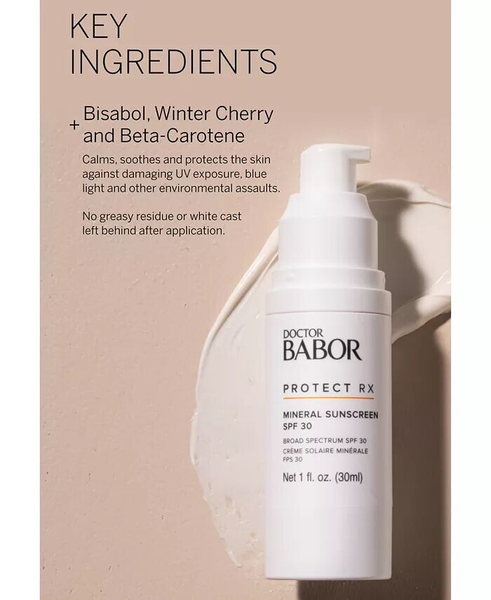 Ненано-минеральная смесь содержит защитные ингредиенты, которые помогают защитить кожу от УФ-излучения, бороться с обезвоживанием и укреплять кожный барьер. Разработанный в соответствии с профессиональными стандартами точности Коллекции космецевтических решений клинического уровня BABOR для любого типа кожи, BABOR Protect RX Mineral Sunscreen SPF 30 быстро впитывается в кожу для ежедневного использования, удобен и очень удобен в использовании.