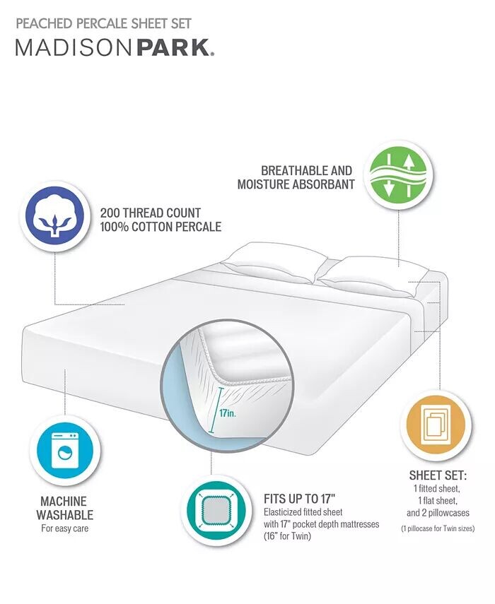 Наши комплекты постельного белья Madison Park из 100% хлопка и перкаля — это все, что вы ожидаете, и даже немного больше. Простыни сотканы в классическом стиле из перкаля, который хорошо пропускает воздух, но при этом очень долговечен. Тот факт, что мы используем только 100% хлопок, делает их еще и влагопоглощающими. Перкаль в сочетании с хлопком делает эту простыню идеальной, если вы ищете более прохладный и комфортный ночной сон. Наши простыни подвергаются очень легкому расчесыванию щеткой, что придает им невероятное ощущение персика на коже. Если вы раньше хотели попробовать листы перкаля, но их отталкивала их четкая рука, то этот лист определенно для вас. Наши простыни из 100% хлопка гипоаллергенны, их можно стирать в машине и подходят для матрасов размером до 17 дюймов. Размер Twin подходит для детей до 16 лет.