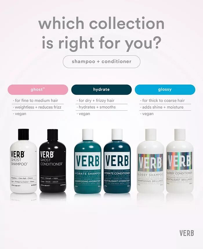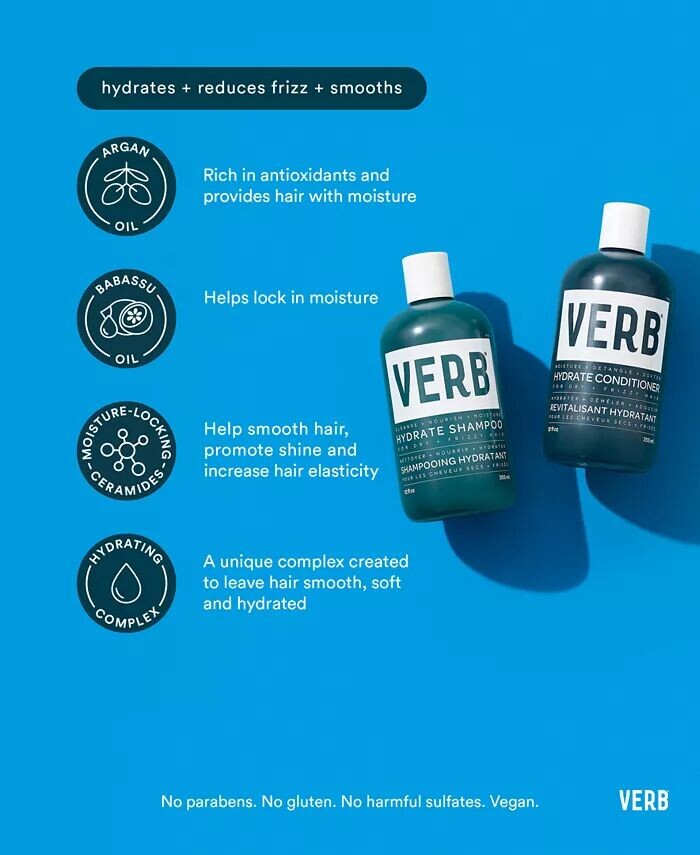 Теперь шампунь Verb Hydrate с новой улучшенной формулой и ароматом мягко очищает и увлажняет сухие, вьющиеся волосы. Этот шампунь, содержащий аргановое масло, масло бабассу, керамиды, удерживающие влагу, и увлажняющий комплекс, обеспечивает питание волос.