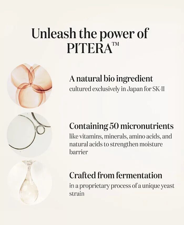 PITERA™: запатентованный натуральный биоингредиент SK-II, полученный в результате ферментации. Он улучшает многочисленные проявления видимых повреждений кожи и старения.