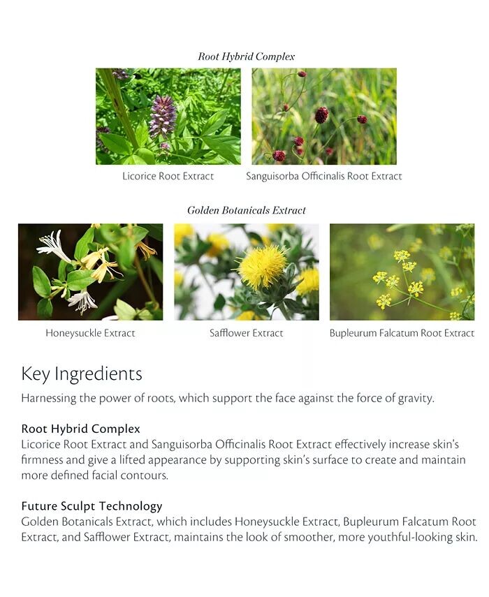 Технология Future Sculpt на основе экстракта Golden Botanicals, включающего экстракт жимолости, экстракт корня Bupleurum falcatum и экстракт сафлора, сохраняет вид более гладкой и молодой кожи