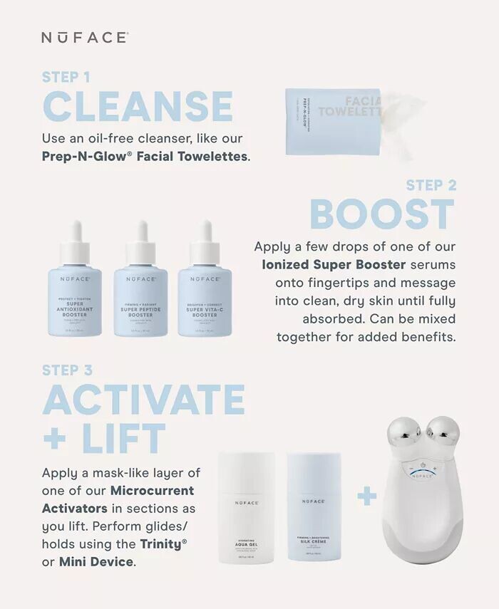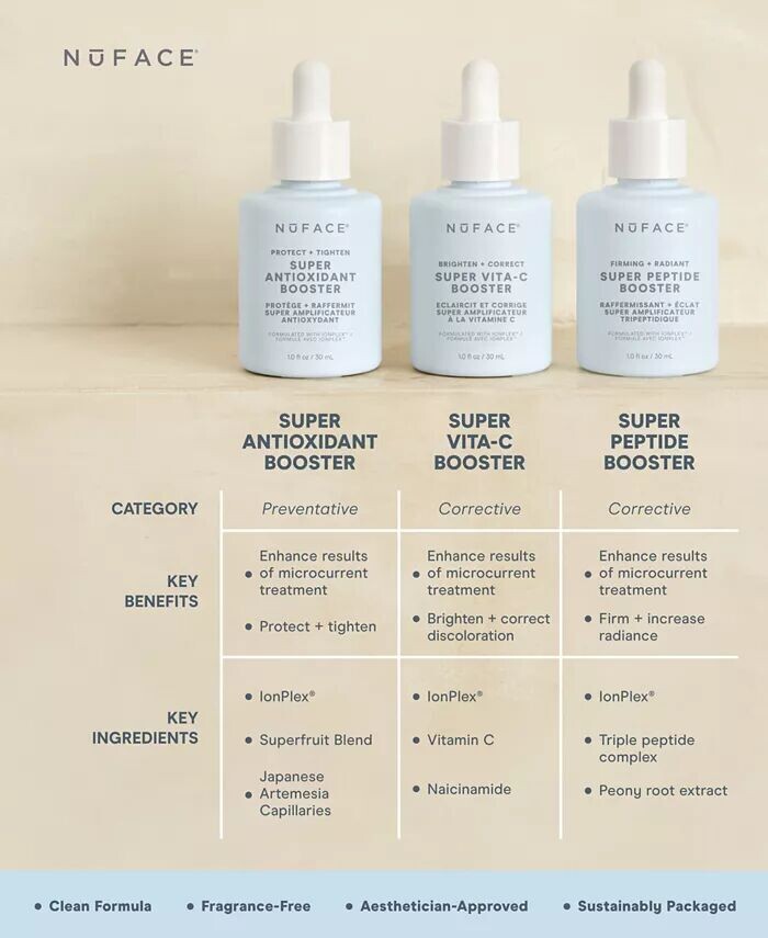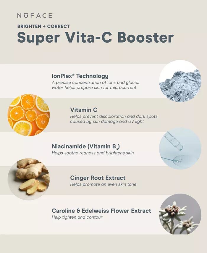 ЧТО ЭТО: Сыворотка-бустер с витамином С, произведенная в США. ЧТО ОНА ДЕЛАЕТ: Помогает уменьшить появление темных пятен, одновременно улучшая результаты микротоковой терапии; уменьшает обесцвечивание и осветляет кожу благодаря витамину С; помогает защитить кожу от будущих солнечных повреждений и обесцвечивания; делает кожу ровной и сияющей ОСНОВНЫЕ ИНГРЕДИЕНТЫ: Ion Plex отличается точной концентрацией ионов и ледяной воды для обеспечения оптимальной работы микротокового устройства Витамин С помогает предотвратить изменение цвета и появление темных пятен, вызванных воздействием солнечных лучей. и ультрафиолетовый свет Ниацинамид (витамин B3) помогает успокоить и осветлить кожу. Экстракт корня имбиря способствует выравниванию тона кожи Карнозин и экстракт цветков эдельвейса помогают укрепить, подтянуть и придать коже контур. СПОСОБ ПРИМЕНЕНИЯ : Очищение: используйте безмасляное очищающее средство. Усиление: нанесите несколько капель сыворотки Vita-C Booster Serum на кончики пальцев и массируйте чистую сухую кожу до полного впитывания; вы даже можете смешать его с одним из других Super Boosters (продается отдельно) для получения дополнительных преимуществ Activate + Lift: наносите маску-подобный слой вашего любимого Nu FACE Microcurrent Activator (продается отдельно) по секциям во время подъема. ; выполняйте скольжение/удержание с помощью вашего любимого устройства Nu FACE Microcurrent (продается отдельно) Завершение: нанесите крем для глаз, увлажняющий крем и SPF ИСПОЛЬЗУЙТЕ С: Nu Стартовый набор FACE Trinity+ Женщина принадлежит