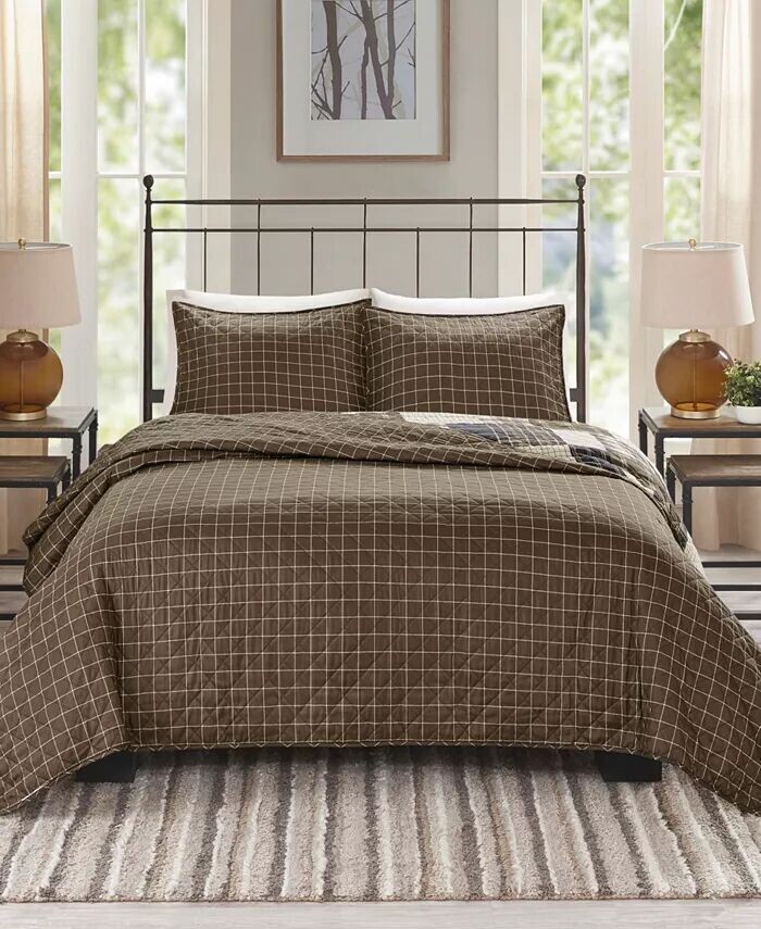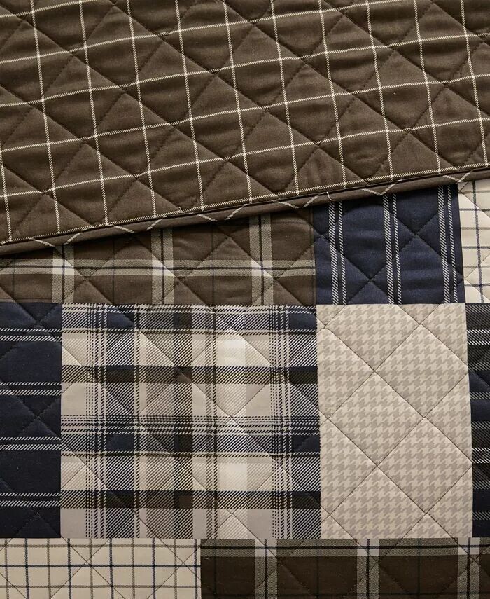 Этот насыщенный цветовой набор станет украшением вашей спальни в стиле домика. Двустороннее покрывало и накидки в деревенском стиле украшены лоскутным принтом коричневых и бежевых оттенков, который на оборотной стороне превращается в чистый и привлекательный клетчатый принт по всей поверхности.