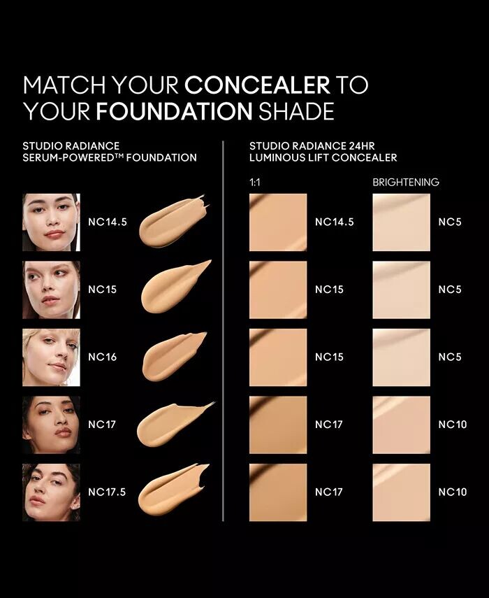 Расставляйте точки, проведите пальцем и подсветите, чтобы скрыть или раскрыть свежий, сияющий, подтянутый вид. Совершенно новый невесомый сияющий консилер MAC обеспечивает 24-часовое среднее покрытие и +90% немедленного увлажнения*, одновременно уменьшая темные круги под глазами на 18%.** В его состав на 80% входят ингредиенты для ухода за кожей, включающие 31 увлажняющий, осветляющий и пухлый компонент. ингредиенты для ухода за кожей, включая ниацинамид, витамин С и гиалуроновую кислоту, чтобы со временем уменьшить появление темных кругов. Он также содержит коктейль из мощных суперпродуктов по уходу за кожей, в том числе оливковое масло и масло жожоба для ухода за кожей. Роскошная текстура легко скользит по коже и плавно растушевывается, обеспечивая сияющий результат без слеживания и образования складок. Консилер Studio Radiance 24HR Luminous Lift Concealer содержит разработанную художником смесь Radiance Blend, состоящую из серебряных и золотых перламутровых частиц, специально созданных для дополнения уникальных оттенков светлой и насыщенной кожи. Он доступен в 44 сияющих оттенках, подходящих к вашему тональному крему Studio Radiance Serum Powered Foundation.