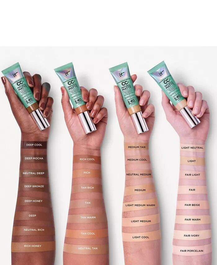 Для всех комбинированных и жирных типов кожи: CC+ Cream Matte Foundation SPF 40 обеспечивает полное увлажнение, контроль блеска на 16 часов и защиту от солнца без белого налета — и все это в одной формуле, устойчивой к поту и невесомой! Другие матовые основы могут сделать вашу кожу плоской, но CC+ Cream Matte Foundation, благодаря своему здоровому виду, делает обратное!
