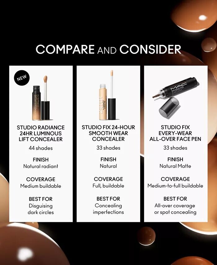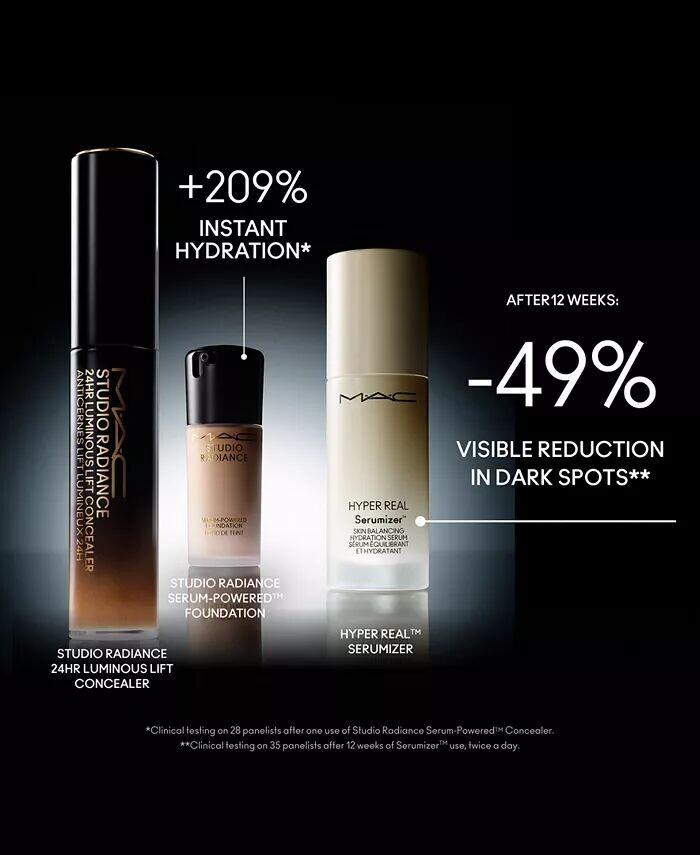 Расставляйте точки, проведите пальцем и подсветите, чтобы скрыть или раскрыть свежий, сияющий, подтянутый вид. Совершенно новый невесомый сияющий консилер MAC обеспечивает 24-часовое среднее покрытие и мгновенное увлажнение на +90%*, одновременно уменьшая с течением времени темные круги под глазами на 18%.** В его состав на 80% входят ингредиенты для ухода за кожей, включающие 31 увлажняющий, осветляющий и пухлый компонент. ингредиенты для ухода за кожей, включая ниацинамид, витамин С и гиалуроновую кислоту, чтобы со временем уменьшить появление темных кругов. Он также содержит коктейль из мощных суперпродуктов по уходу за кожей, в том числе оливковое масло и масло жожоба для ухода за кожей. Роскошная текстура легко скользит по коже и плавно растушевывается, обеспечивая сияющий результат без скатывания и образования складок. Консилер Studio Radiance 24HR Luminous Lift Concealer содержит разработанную художником смесь Radiance Blend, состоящую из серебряных и золотых перламутровых частиц, специально созданных, чтобы дополнять уникальные оттенки светлой и насыщенной кожи. Он доступен в 44 сияющих оттенках, подходящих к вашему тональному крему Studio Radiance Serum Powered Foundation.