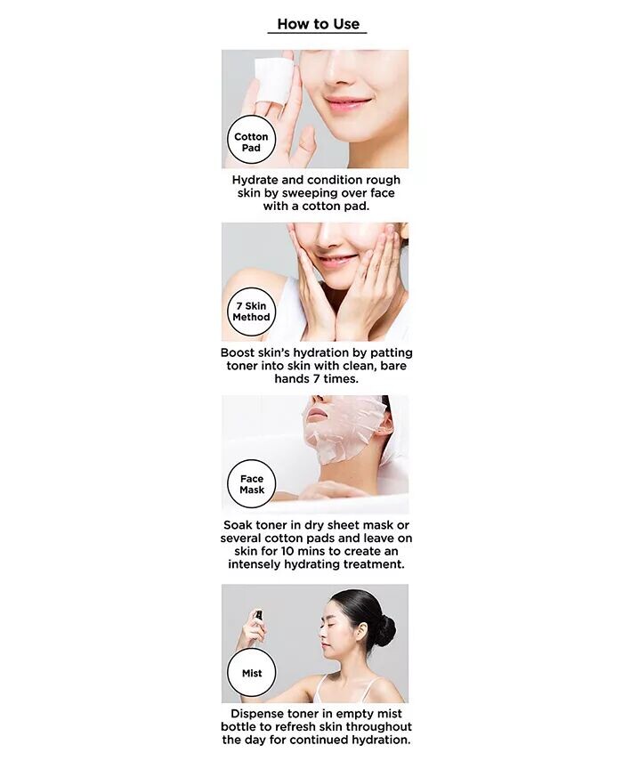 Для сухой, обезвоженной кожи: Следуя методу «7 кожи», нанесите тоник чистыми голыми руками; аккуратно втирайте в кожу до полного впитывания; повторить 7 раз; продолжайте процедуру ухода за кожей.