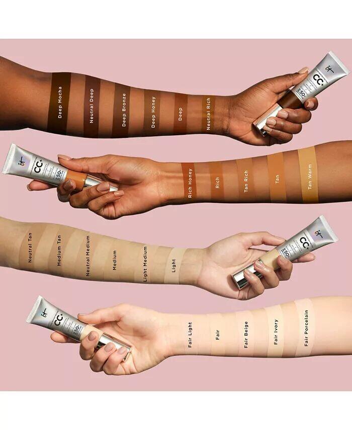 Крем CC+ от IT Cosmetics с SPF 50+ — SPF тональный крем №1 в Америке*! Этот универсальный продукт представляет собой тональную основу полного покрытия, увлажняющую и антивозрастную сыворотку и солнцезащитный крем широкого спектра действия. Насыщен такими ухаживающими за кожей ингредиентами, как гиалуроновая кислота, ниацинамид и витамин Е. Теперь в НОВЫХ оттенках!