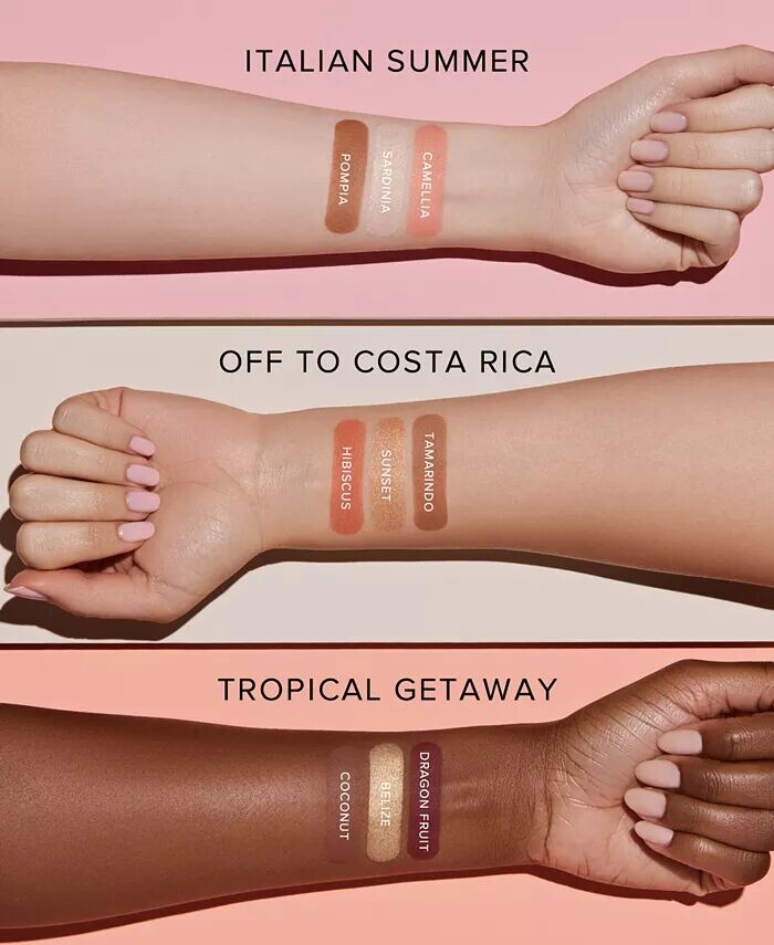 ОТТЕНКИ: Итальянское лето: Pompia (светло-золотисто-медовый), Сардиния (светло-бледное золото), Camellia (мягкий коралл с золотым жемчугом). Off To Costa Rica: Tamarindo (янтарно-коричневый), Sunset Beach (мерцающая бронза). золото), Hibiscus (яркий коралл) Tropical Getaway: Coconut (темное красное дерево), Belize (мерцающее сияющее золото), Dragon Fruit (насыщенная ягода) ЧТО ОНО ДЕЛАЕТ: Бронзер: гладкая, пудровая формула тает на коже, создавая вид загорелого; чрезвычайно растушевываемая, мягкая текстура с легким ощущением и бесшовным послевкусием; Легко прилегает к коже и сохраняет цвет. Хайлайтер: формула сияющей пудры с ультрамелкими жемчужинами, которые обеспечивают гладкое, интенсивное сияние; обеспечивает мгновенное сияние и наращиваемую интенсивность с длительным эффектом; шелковистая, гладкая формула скользит по коже и обеспечивает плавную растушевку. Румяна: гладкая пудровая формула тает на коже, придавая сияющий цвет; чрезвычайно растушевываемая, мягкая текстура с легким ощущением и бесшовным послевкусием; Создаваемая формула обеспечивает цвет от нежного до яркого. Новые сияющие оттенки подчеркивают любой тон кожи. Обеспечивает мгновенное сияние и тепло для длительного сияния. Сверхгладкая, легкая формула маслянистая на ощупь и обеспечивает безупречное сияние. смесь Легкая в нанесении, формула легко скользит по коже и сохраняет цвет Можно использовать на лице и теле ОСНОВНЫЕ ИНГРЕДИЕНТЫ: Бронзатор: инкапсулированный рисовый крахмал придает коже ощущение осязаемости мягкость; Технология разглаживания кожи и совершенствования света обеспечивает шелковистый и яркий оттенок. Хайлайтер: сферические пигменты равномерно рассеивают свет, создавая красивый, сияющий результат; светорассеивающие пигменты помогают уменьшить видимость несовершенств и тонких линий. Румяна: технология разглаживания кожи и совершенствования света обеспечивает шелковистый и яркий результат. КАК ИСПОЛЬЗОВАТЬ: Бронзер: придайте форму и подчеркните свои черты лица с помощью нанесение по линии роста волос, висков, скул и линии подбородка; слегка проведите по всему лицу, чтобы придать ему загорелый вид; нанесите на кончик и бока носа для большей четкости. Хайлайтер: подчеркните свои черты лица, нанеся на верхнюю часть скул, переносицу и кончик носа, внутренний угол глаза, верхнюю часть брови, дугу Купидона и ключицу. ; для сильного сияния нанесите слой вверх Румяна: подчеркните свои черты лица и добавьте румянец, нанеся их на центр щек и растушевывая по направлению к линии роста волос; поднимите его на новый уровень, проведя по переносице, чтобы придать свежий вид. Советы профессионалов: при нанесении хайлайтера распылите кисть A23 Pro Brush спреем Dewy Set Setting Spray для получения интенсивного результата; смешивайте оттенки, чтобы создать индивидуальный цвет; нанесите хайлайтер и бронзер на шею и зону декольте