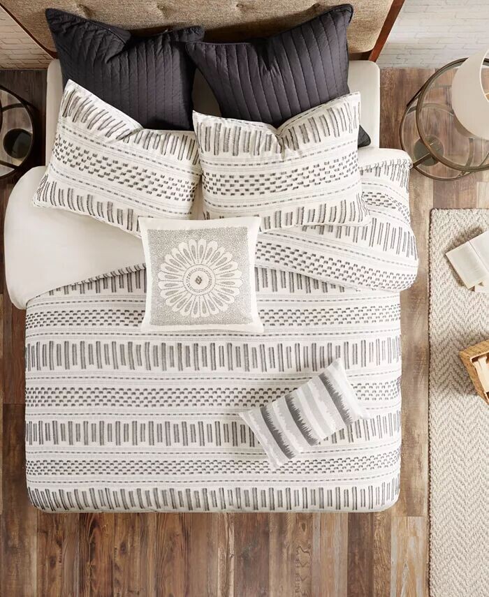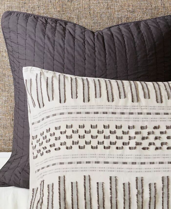 Придайте своей спальне уютный вид загородного дома с помощью мини-набора хлопкового жаккардового одеяла Rhea от INK+IVY. Хлопковое одеяло цвета слоновой кости украшено горизонтальными полосками угольных оттенков и ткаными деталями, напоминающими ресницы, которые добавляют очаровательный акцент верхней части кровати. Скрытые закрепки создают чистый вид одеяла, напоминающий пуховое одеяло, а соответствующие накладки имитируют дизайн верхней части кровати, дополняя комплект постельного белья из хлопкового жаккарда. Этот жаккардовый комплект одеял, изготовленный из 100% хлопка, можно стирать в машине, что упрощает уход и придает непринужденный шарм декору вашей спальни.