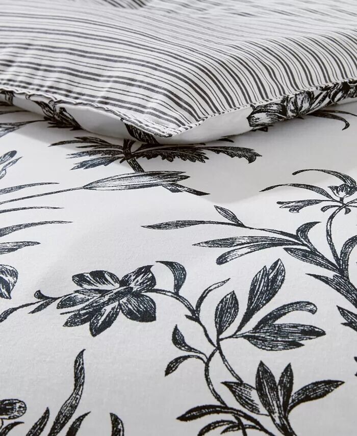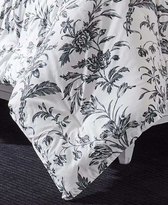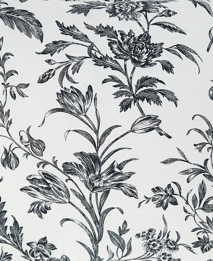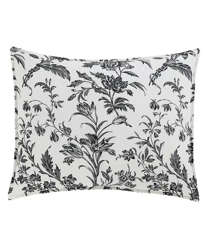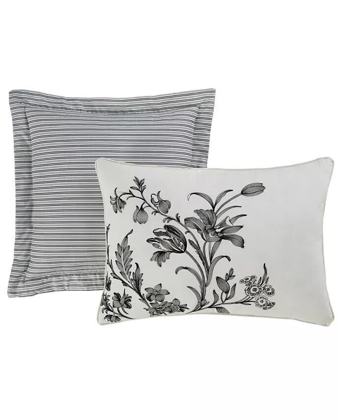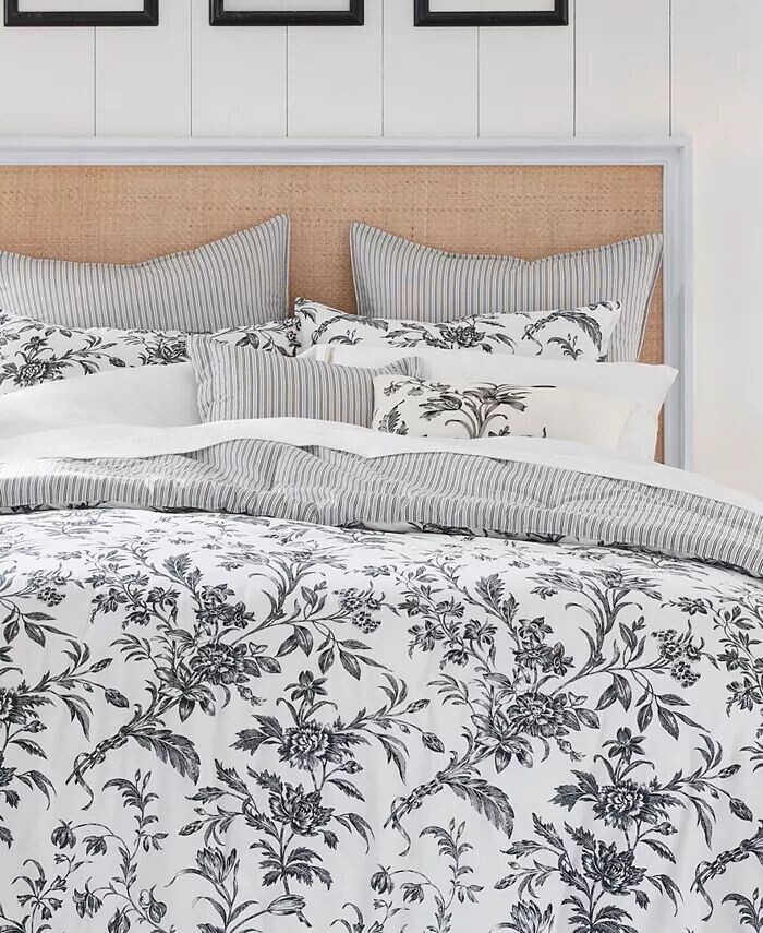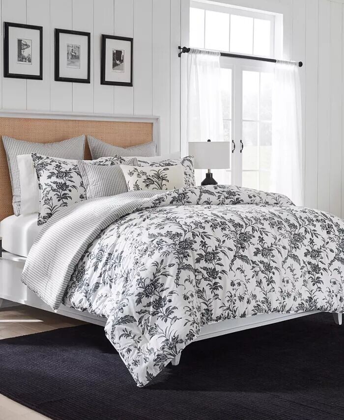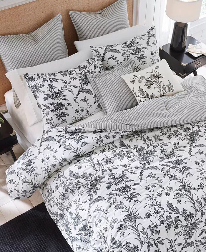 Цветочные дизайны туалетных комнат имеют вневременную привлекательность, а Amberley — это классика черного и мягкого белого цветов. Хлопковое одеяло превращается в классическую черно-белую полоску тикинга, которая повторяется на европейских накидках и квадратной декоративной подушке.