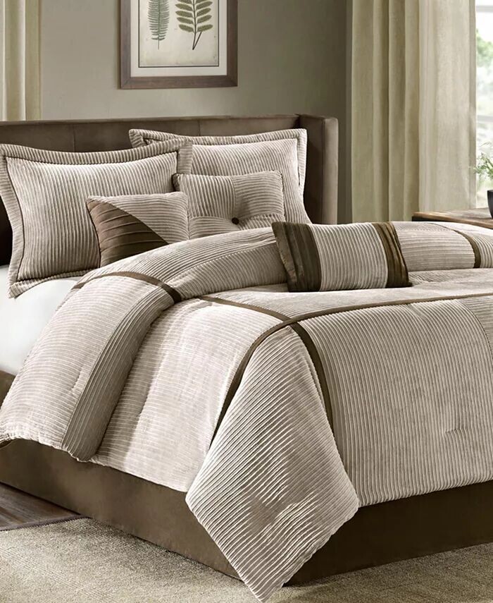 Добавьте роскоши и текстуры в любое пространство с помощью уютного вельвета, богатых деталей из искусственной замши и декоративных подушек из этого комплекта одеял Dallas от Madison Park.