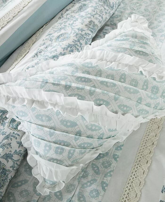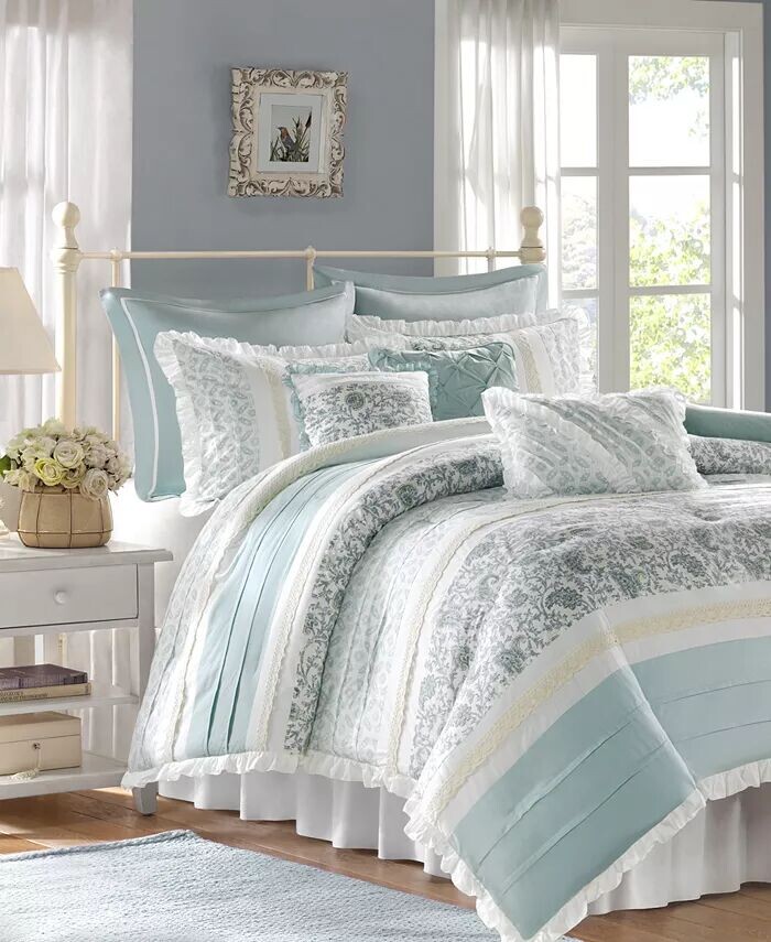 В комплект входят: королевское одеяло (104 x 92 дюйма), юбка королевской кровати (78 x 80 дюймов + 15 дюймов), два королевских покрывала (20 x 36 дюймов + 2 дюйма), два европейских покрывала (26 x 26 дюймов). ) и три декоративные подушки (16 x 16 дюймов, 18 x 18 дюймов, 12 x 18 дюймов).