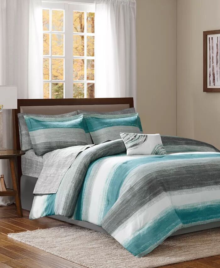 Комплект одеял Essentials Saben от Madison Park представляет собой современный подход к традиционному дизайну в полоску. Акварельная техника придает текстуру серо-коричневым, оливково-зеленым, белым и серым полосам на одеяле и накидке. Комплект хлопкового постельного белья плотностью 180 нитей станет прекрасным дополнением к этой коллекции вместе с одной декоративной подушкой с вышивкой и юбкой для создания завершенного образа.