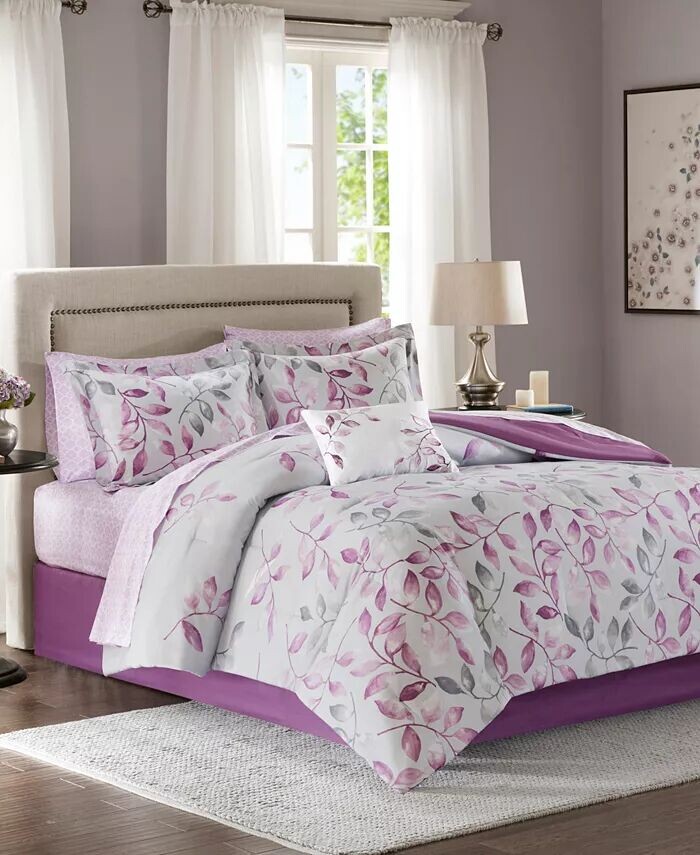 Добавьте изысканности в любую комнату с помощью комплекта одеял Essentials Lafael от Madison Park. На одеяле изображены фиолетовые и серые цветочные листья, изящно доносящиеся к изножью кровати, на белом фоне, который превращается в сплошной фиолетовый. Соответствующий декор и декоративная подушка с вышивкой подчеркивают цветочный мотив и придают этому комплекту дополнительный шарм. Пурпурно-белый комплект простыней и фиолетовая юбка прекрасно гармонируют с остальными деталями ансамбля, завершая образ.