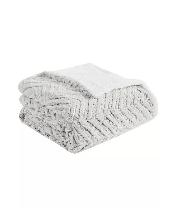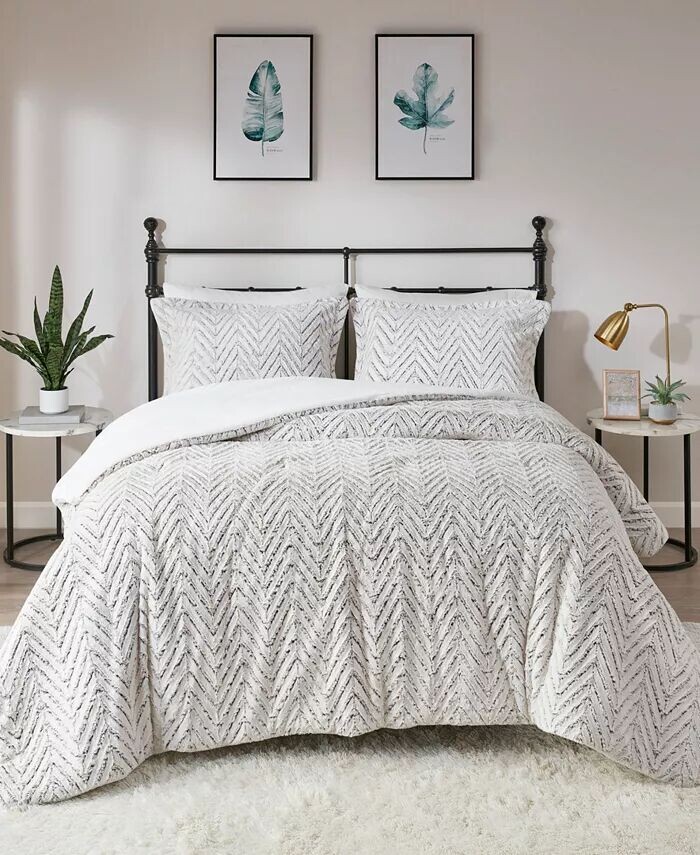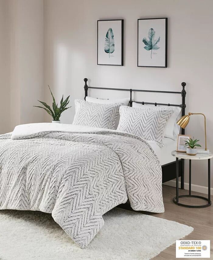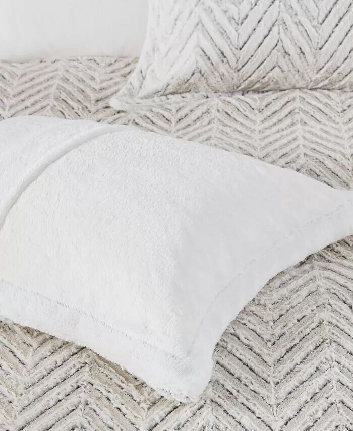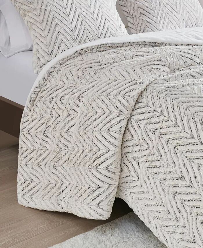 Длинный начесованный искусственный мех на лицевой стороне ультраплюшевого пододеяльника Adelyn от Madison Park украшен шевронным узором, подчеркнутым более темными оттенками для создания дополнительной глубины.