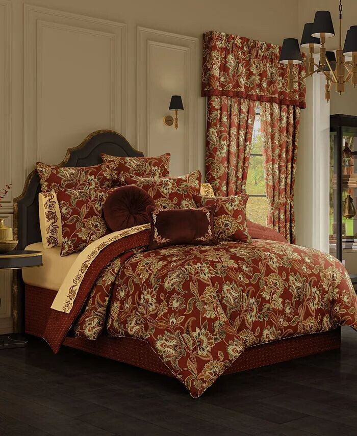 Комплект одеял Montecito украшен красивым разноцветным цветочным узором в стиле Якобе. Цвета включают тона золота и пряностей, подчеркнутые драматическим фоном.