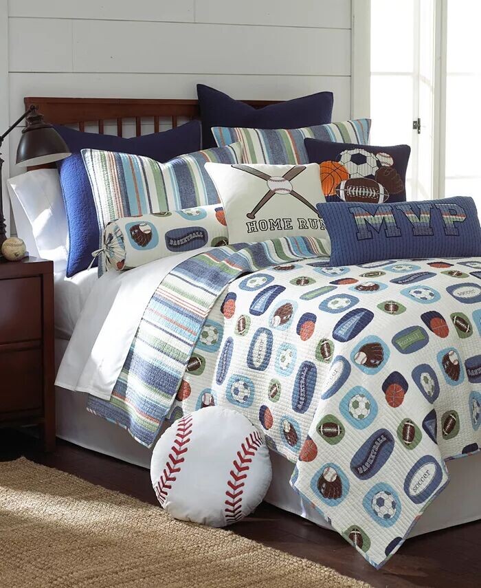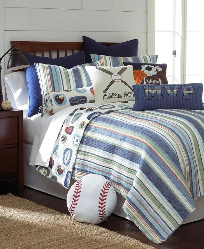 В комплект двойного одеяла Levtex Home MVP входит одно двойное одеяло и одно стандартное одеяло белого, синего, зеленого и красного цветов. Коллекция MVP отличается спортивным дизайном и полосками, которые сделают комнату вашего мальчика уникальной.