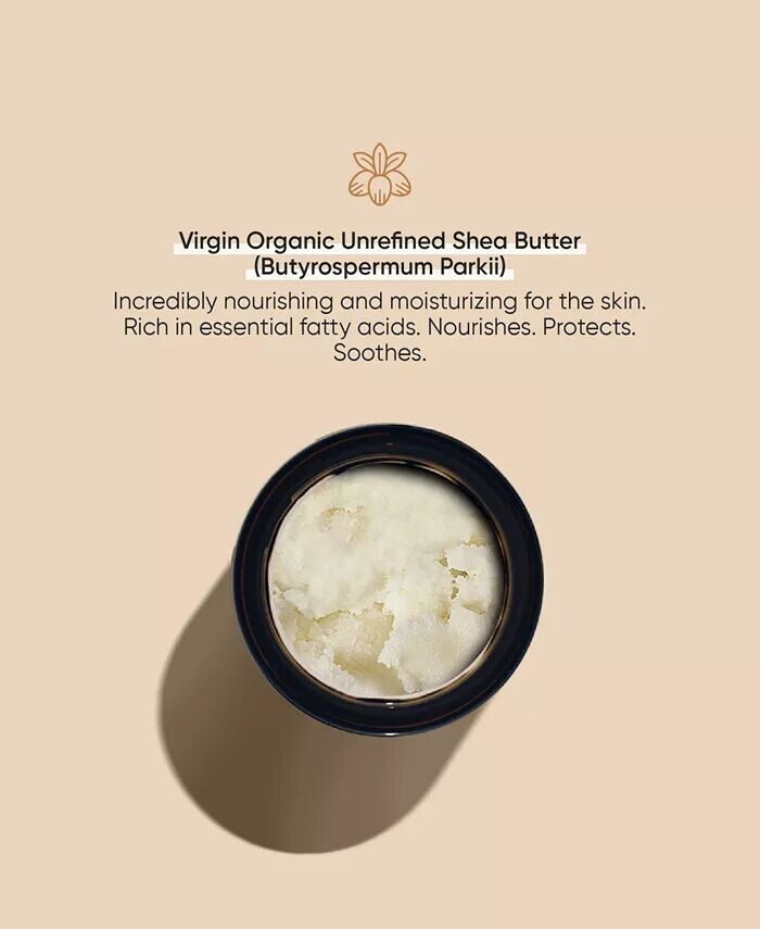 В состав взбитого масла для тела входит 100% натуральное и органическое масло ши первого отжима, импортированное из Африки. Оно богато витамином А. , B и E (которые помогают при неровной коже), а также стеариновая и олеиновая кислоты