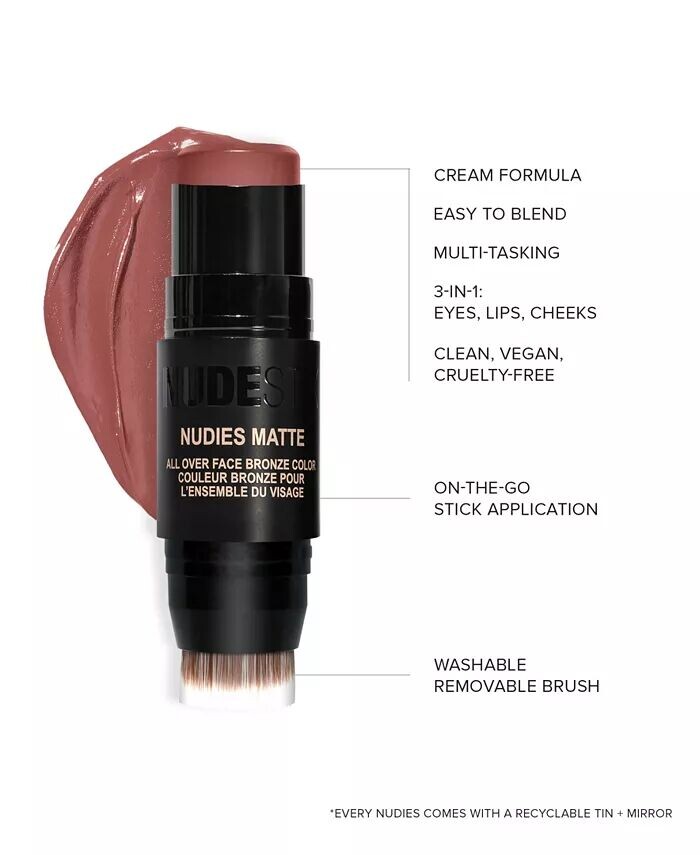 Попробуйте размотать кисть и провести по цветному бальзаму, а затем нанести непосредственно на щеки и губыИспользуйте с Tinted Blur Stick, матовыми румянами Nudies Matte All-Over Blush Color, Nudies Glow All-Over Highlight.