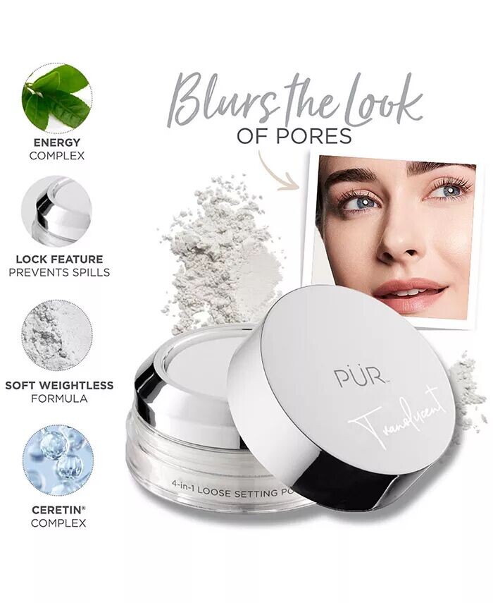 Закрепите, не переживайте, с помощью рассыпчатой ​​пудры PUR 4-в-1. Эта легкая закрепляющая пудра с содержанием средств по уходу за кожей обеспечивает не осыпающееся покрытие, создавая мягкий эффект аэрографа.
