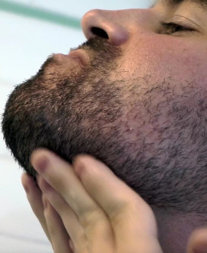Нанесите небольшое количество средства размером с десять центов на волосы на лице и тщательно помассируйте.