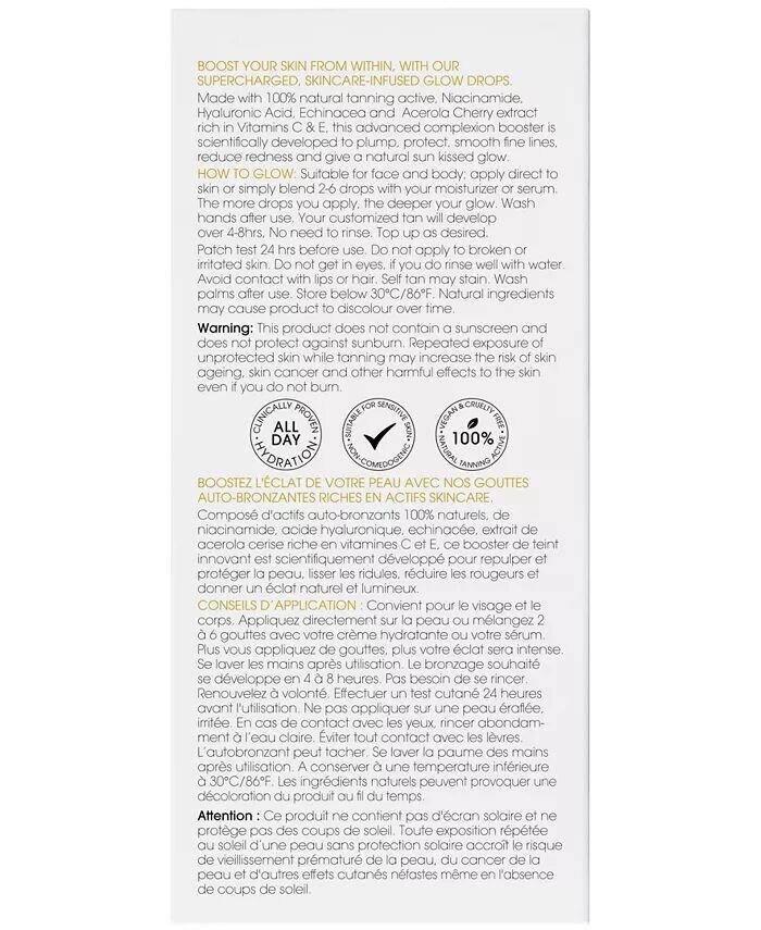 Обогащено превосходной технологией двойного загара и высокоэффективными ингредиентами для ухода за кожей, включая ниацинамид, гиалуроновую кислоту, эхинацею и витамин Е