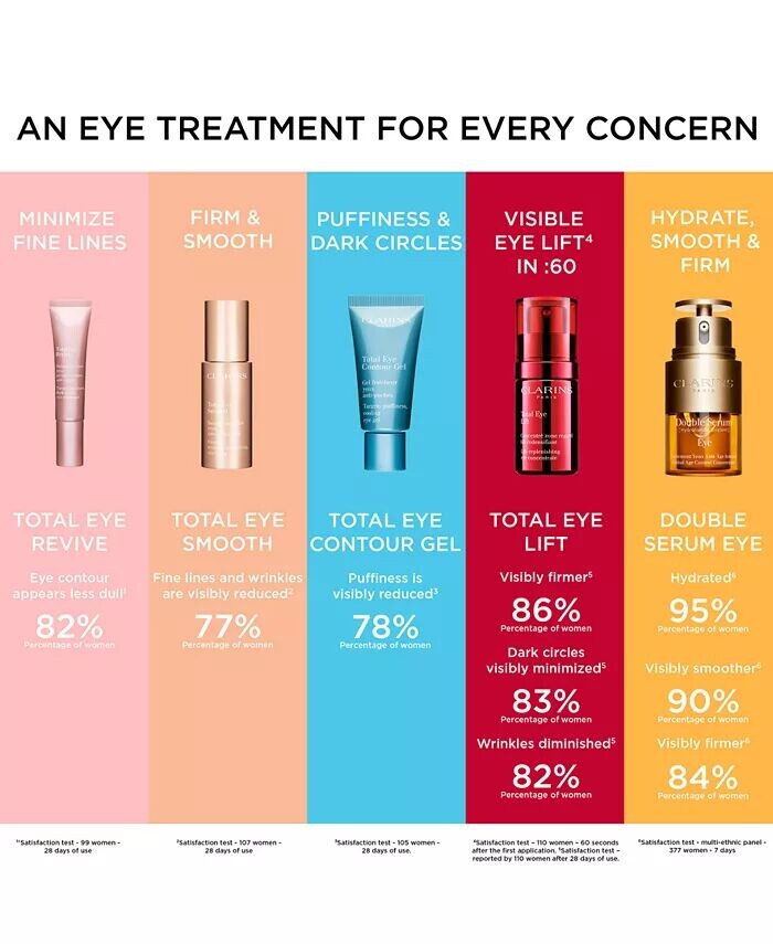 Total Eye Smooth (ранее Extra-Firming Eye) — это экспертное решение Clarins для глаз от морщин и потери упругости, теперь обновленное и обновившееся. Питательный бальзам и маска для глаз 2-в-1 (обогащенные смесью экстрактов цветов кенгуру и митракарпуса) помогают заметно укрепить и увлажнить кожу, разгладить морщины, одновременно борясь с темными кругами и отечностью. Шелковистая, как сыворотка, и обволакивающая, как бальзам, инновационная текстура, заполняющая морщины, помогает уменьшить морщины, делая глаза заметно более упругими и гладкими. Сенсорная текстура достаточно нежная для людей с чувствительными глазами и тех, кто носит контактные линзы.