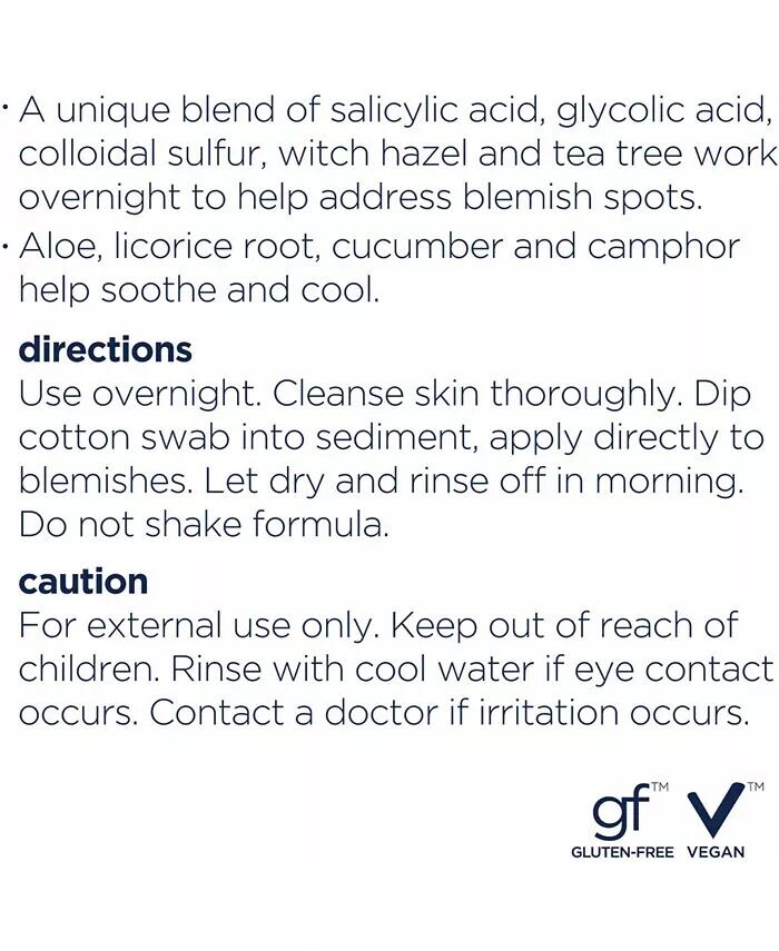 ЧТО ОНО ДЕЛАЕТ: Помогает обеспечить целенаправленное точечное лечение Помогает бороться с пятнами в течение ночи Помогает успокоить и успокоить кожу Протестировано дерматологами и аллергиками КАК ИСПОЛЬЗОВАТЬ: Использовать на ночьПосле очищения и высушивания кожи окуните на дно чистый ватный тампон и нанесите на пятна только белый осадок Дайте высохнуть, затем очистите утром Не встряхивайте флакон Осторожно: избегайте попадания в глаза и область глаз; при попадании в глаза промойте прохладной водой Если возникает неприятная сухость или шелушение, сократите частоту использования Не используйте этот продукт, если у вас очень чувствительная кожа или если вы чувствительны к сере