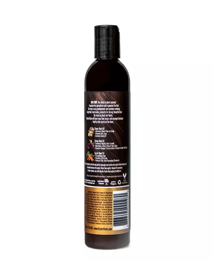 Разглаживающий шампунь Rucker Roots содержит оливковое масло, кокосовое масло, сок листьев алоэ, витамины А, С, Е, К и В, а также масла моркови, имбиря и репы, необходимые для сильных, блестящих и растущих волос.