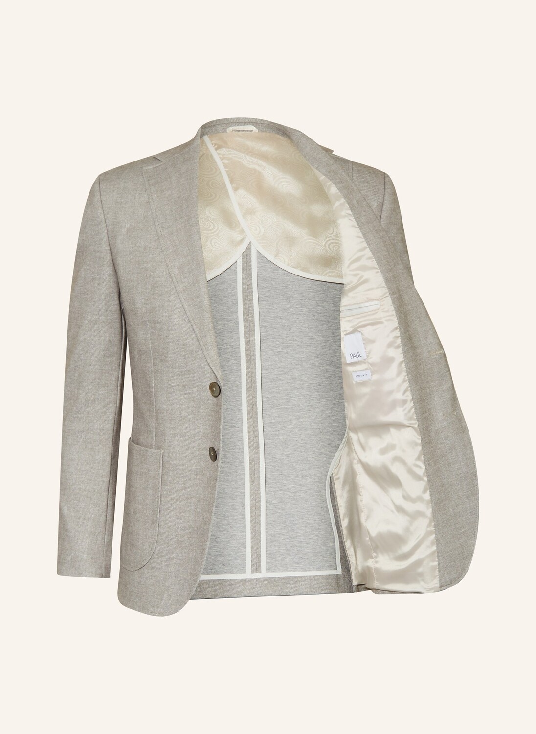 Особенности Посадка по данным производителя: Extra Slim Fit Нисходящие лацканы с петлями для пуговиц Подворотник с фетровой отделкой Однобортный с двумя пуговицами Простой карман на уровне груди Подкладку прорезного кармана можно оформить как нагрудный платок Поцелуйные пуговицы на края рукавов Накладные карманы Две боковые разрезы Внутренние карманы Гладкая внутренняя подкладка на рукавах и в передней части Качество джерси Пятный вид