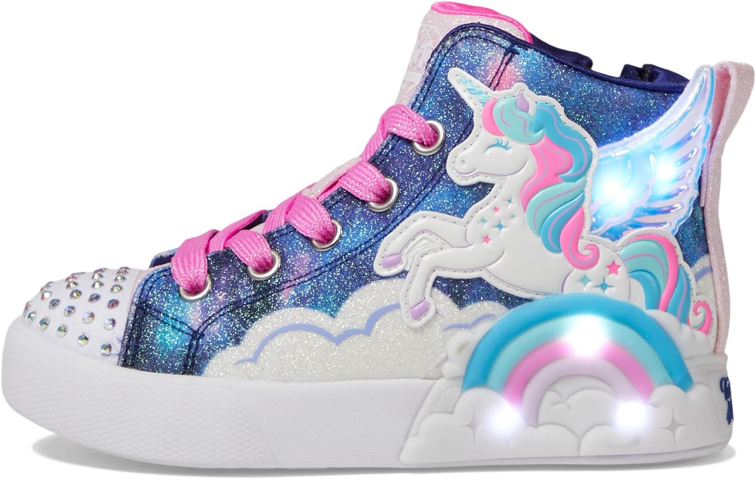 Ослепите шаги вашего ребенка волшебным весельем с кроссовками SKECHERS KIDS Twinkle Magic. Эти светящиеся высокие кроссовки имеют блестящий парусиновый верх с изображением летящего единорога и облаков сбоку и украшенный стразами носок. Мягкая комфортная стелька EVA и нейлоновая подкладка обеспечивают комфорт в течение всего дня. Эти высокие кроссовки поставляются с застежкой-молнией сбоку для легкого надевания и снимания. Красочные и мягкие, добавьте привлекательности в наряд вашего ребенка с этими кроссовками на шнуровке.