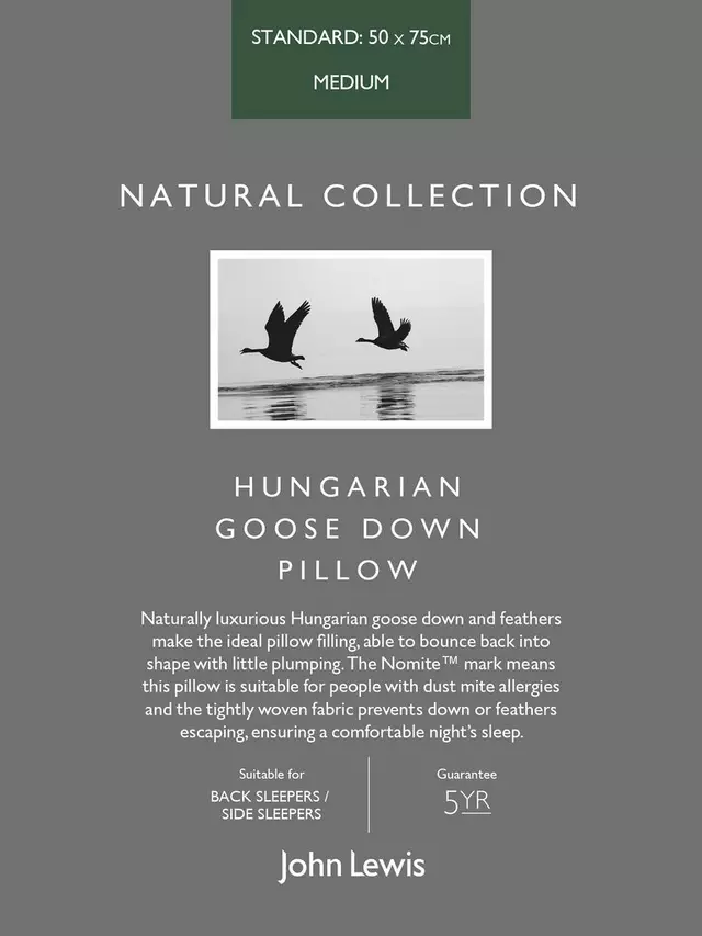 Натуральный роскошный венгерский гусиный пух и перья являются идеальным наполнителем подушки, способным восстанавливать форму при небольшом набухании. Маркировка Nomite означает, что эта подушка подходит для людей с аллергией на пылевых клещей, а плотно сотканная ткань предотвращает выпадение пуха или перьев, обеспечивая комфортный ночной сон.