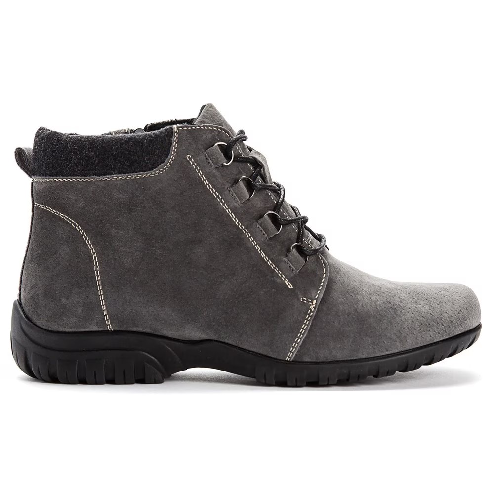 Начните новое приключение в ботинках Delaney от Propet. Верх из замши или кожи в стиле ботинка с круглым носком Шнуровка для надежной посадки с язычком Воротник с мягкой подкладкой из твидовой ткани для дополнительной поддержки Защитная обработка Scotchgard для отталкивания воды и пятен Подкладка Nylex с мягкой стелькой из пеноматериала EVA с эффектом памяти для поддержки в течение всего дня и круглогодичного ношения Прочная резиновая подошва с хорошим сцеплением