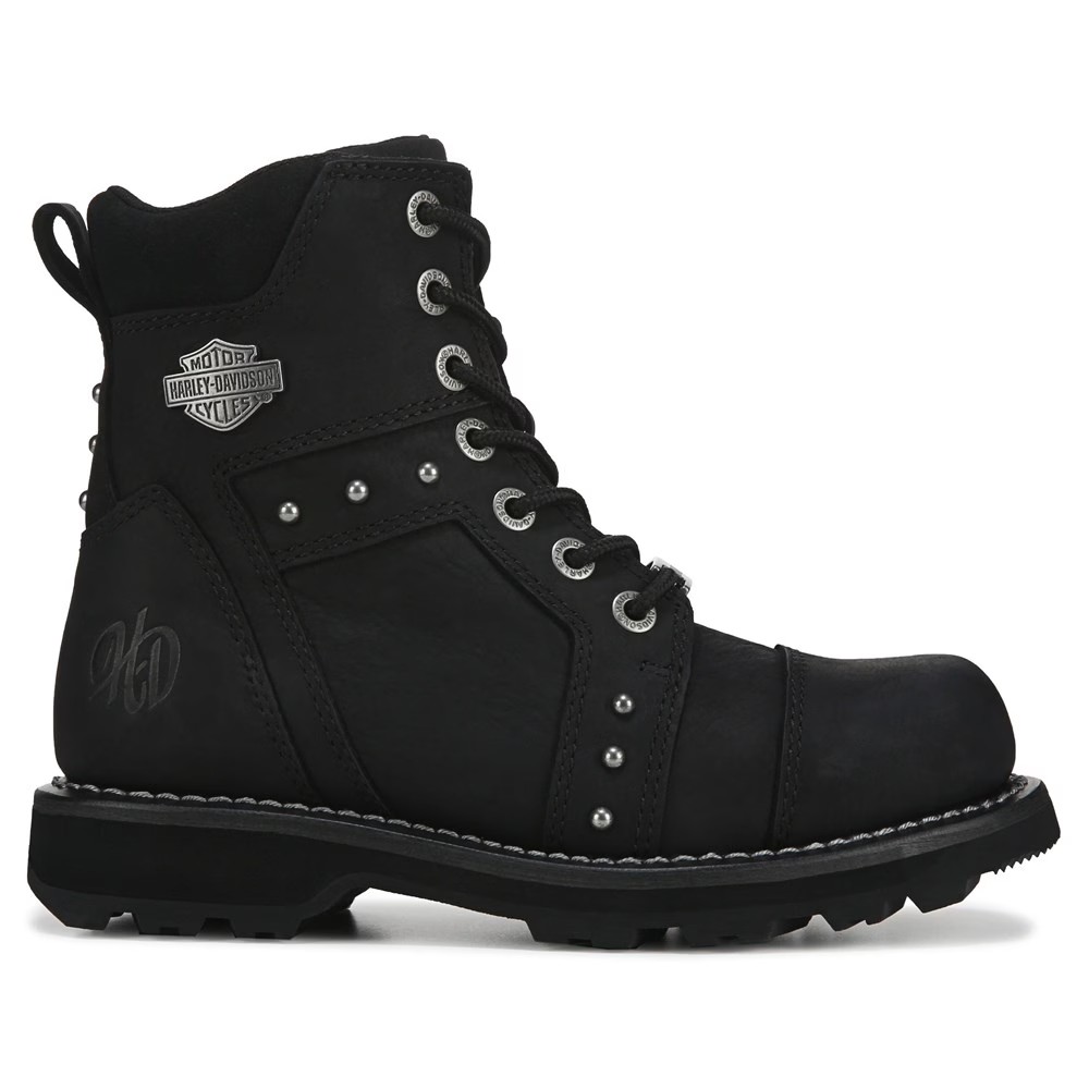 На дороге в женских ботинках Harley Davidson Oakleigh Lace Up. Кожаный верх в стиле армейских ботинок на шнуровке с круглым носком Боковая застежка-молния со шнуровкой Высота голенища 5 и 1/2 дюйма Декоративная фурнитура и заклепки Дышащая сетчатая подкладка с удобной стелькой Конструкция Goodyear Welt для долговечности Промежуточная подошва из вспененного ЭВА для поддержки Прочная резиновая подошва с выступами для сцепления Каблук 1 и 1/4 дюйма