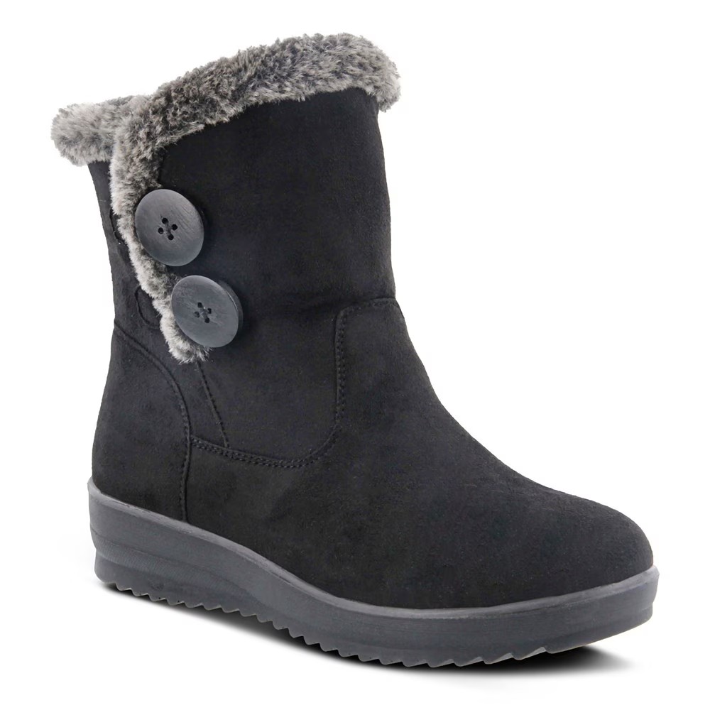 Женские водонепроницаемые зимние ботинки Flexus Istra. Верх из микрозамши в стиле зимних ботинок с круглым носком Надеваются с помощью застежки-липучки Отделка из искусственного меха и шнуровка-резинка спереди Декоративные пуговицы Мягкая подкладка из искусственного меха со съемной комфортной стелькой Окружность 13,5 дюймов, голенище 6 1/2 дюйма Водонепроницаемость благодаря гибкой полиуретановой подошве