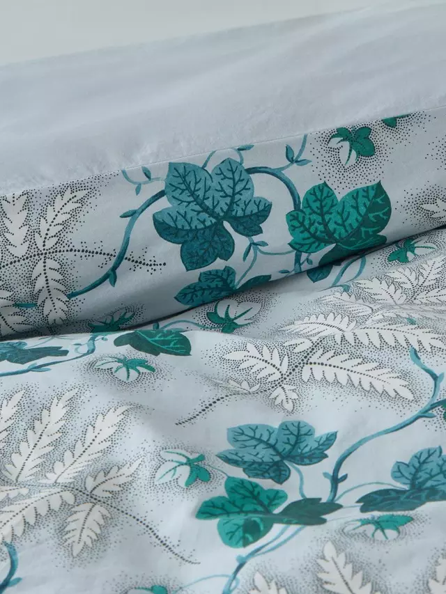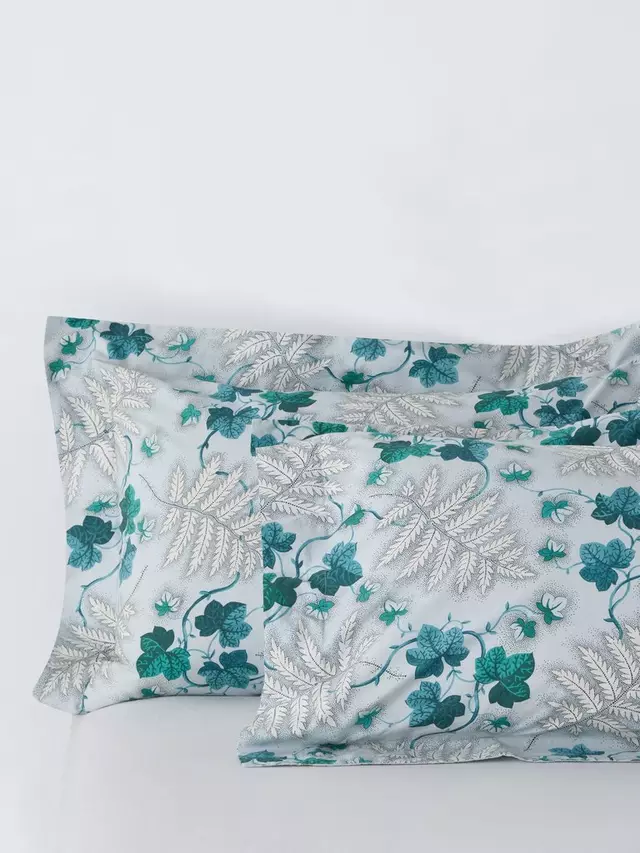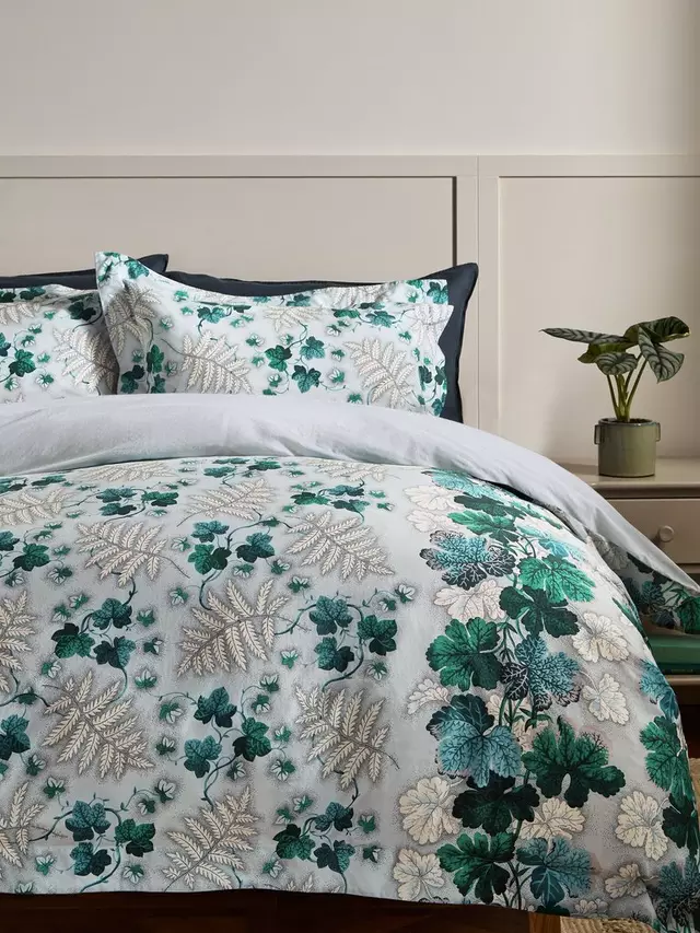 Это красивое постельное белье из хлопка плотностью 200 нитей имеет умиротворяющий рисунок из листьев и серебристых папоротников с простой белой изнанкой. Все комплекты содержат 2 наволочки Oxford.