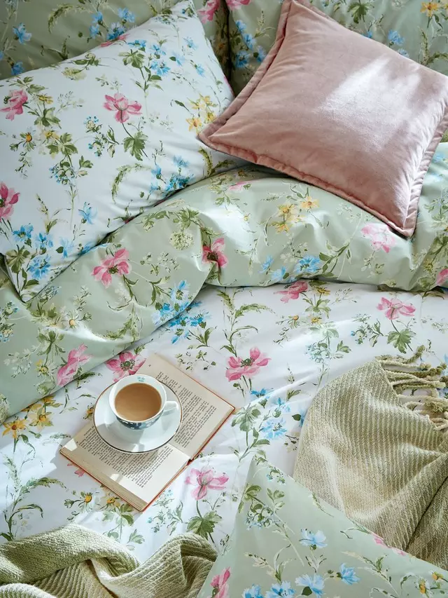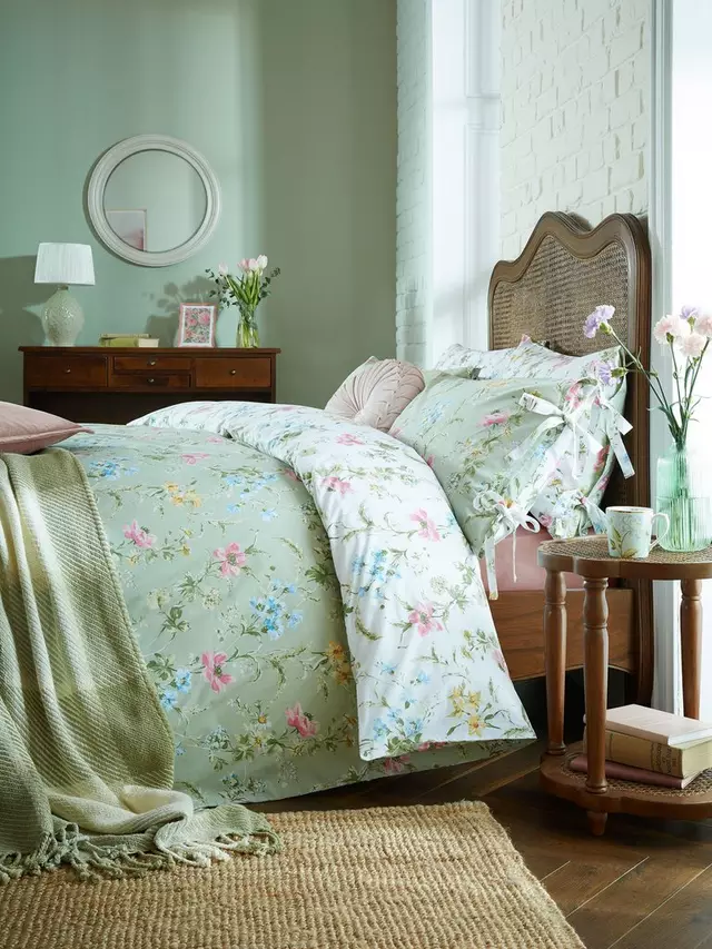 Живописные цветы, такие как васильки, маки и нарциссы, расположены на красивом, свежем зеленом фоне на этом нежном и красивом постельном белье из 100% хлопка.